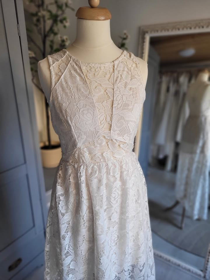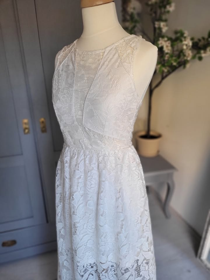 Nagyon könnyű, különleges szabású csipkeruha. Alsó rétege combközépig ér.